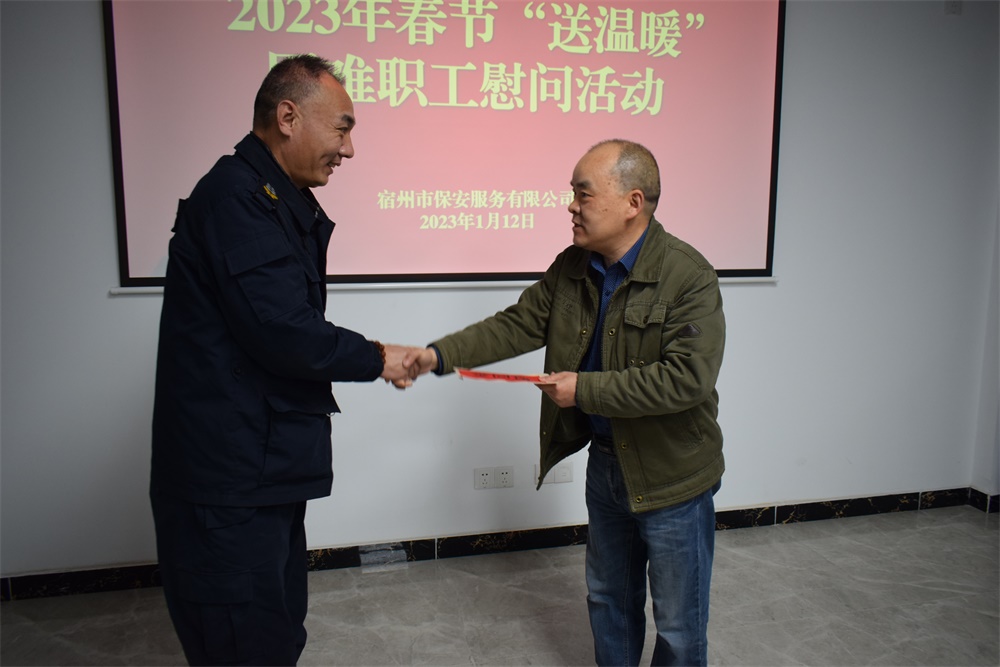 2023年春節(jié)將至,為深入貫徹黨的二十大精神,切實(shí)把對(duì)困難職工的關(guān)心、關(guān)愛、關(guān)注實(shí)實(shí)在在落實(shí)到行動(dòng)上,幫助困難職工家庭度過一個(gè)祥和、溫馨的新春佳節(jié),宿州市保安服務(wù)有限公司以習(xí)近平新時(shí)代中共特色社會(huì)主義思想為指導(dǎo),于1月12日下午組織開展了2023年春節(jié)“送溫暖”困難職工慰問活動(dòng)。本次“送溫暖”活動(dòng)主要聚焦本人、子女、配偶及個(gè)人供養(yǎng)父母患有重大病患,長(zhǎng)年服藥治療造成家庭經(jīng)濟(jì)困難的以及系建檔立卡貧困戶的公司在職員工。